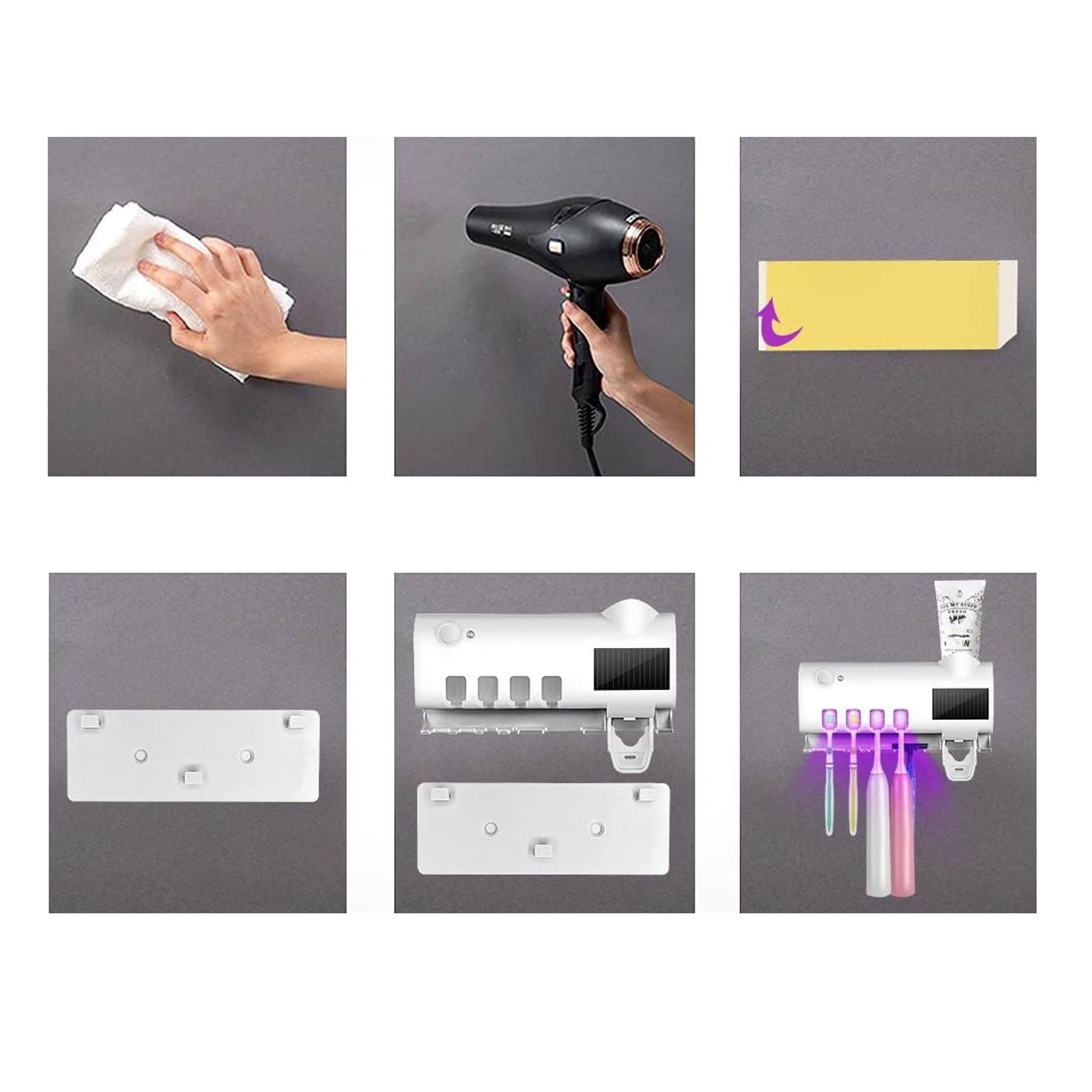 Soporte y accesorios de baño con esterilizador UV capaz de eliminar el 99,9% de las bacterias de los cepillos de dientes para una máxima higiene. Fácil de instalar, sin taladrar, clavar, etc., el dispositivo viene con un fuerte adhesivo de montaje, sin rastros de instalación, no daña la pared. Puedes colgar artículos que quieras en la parte inferior, como maquinas de afeitar, hilo dental, raspador de lengua, etc. Recarga por energía ligera + recargable por USB. Desinfectante para cepillo de dientes con batería de litio integrada de 2600 mAh y panel solar.