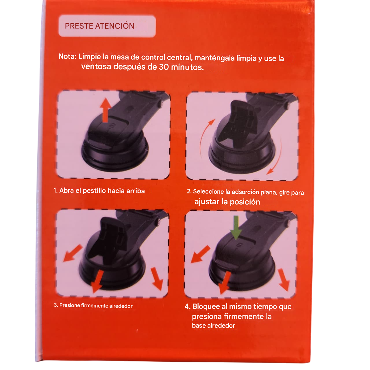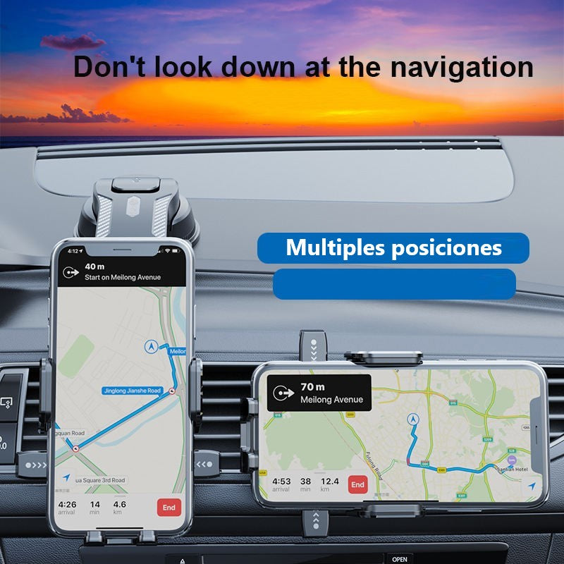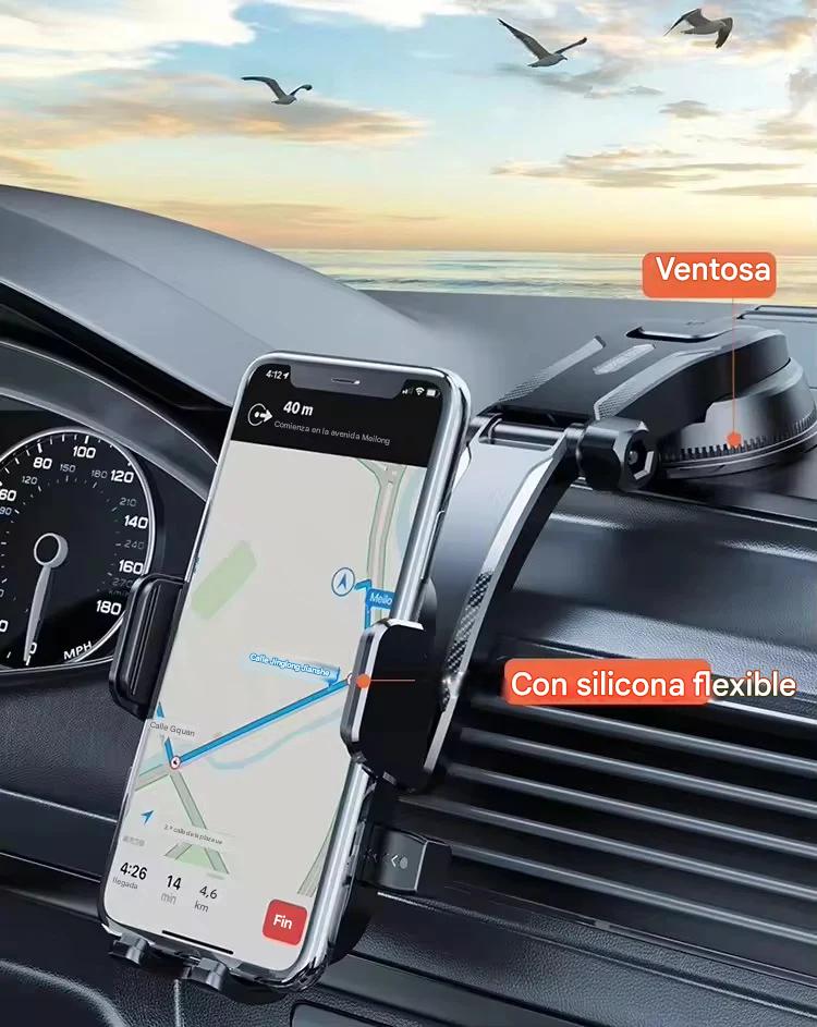 Soporte giratorio para teléfono móvil.Función de ventosa para pegar en superficies planasAjustable para cambiar la posición del teléfono.Fácil de instalar: solo necesitas abrir el pestillo y presionar firmemente .Compatibilidad con diferentes tamaños de teléfono.Mantiene tu teléfono seguro mientras conduces, evitando distracciones.Evita que el teléfono se caiga o se deslice durante el viaje.Facilita el uso de GPS o llamadas sin tener que sostener el teléfono.Se puede montar en el auto fácilmente con una ventosa que se adhiere firmemente.
